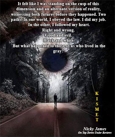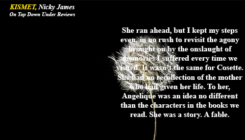 Nicky James leans into the serial killings and the detective/forensic work in Kismet. There is also a romance in the background between Kobe and Dominique. In between work and grief, they steal what they can. Dominique does try to resist Kobe but Kobe is sweet, an appealing juxtaposition of old and young. That Kobe wants to help people and sometimes that comes out in his unfiltered, ‘they had it coming‘ utterances doesn’t scare Dominique off. Kobe has fallen hard for Dominique and Cosette. I thought this book was very raw and visceral and psychologically real in terms of the relationship between Kobe and Dominique. The attachment. I’m a sucker for a sad story. A complex one. I got that here in spades.