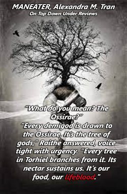 she’s ever seen before. The trees are alive. Then there’s the Ossirae, the tree of all trees in Tohriel. The tree of gods, demigods and goddesses. Raithe, a son of Vengeance, seeks Odessa out, telling her he’s always watched her from a distance. He starts to teach her about this realm and her status as a daughter of Wrath, how you bargain with humans when they need your skillset and that sustains you. Raithe appears to also be a love interest for Odessa but she has nothing left to give him by the time she becomes aware of this realm. Her status, Raithe, what that all means is another complexity for her.